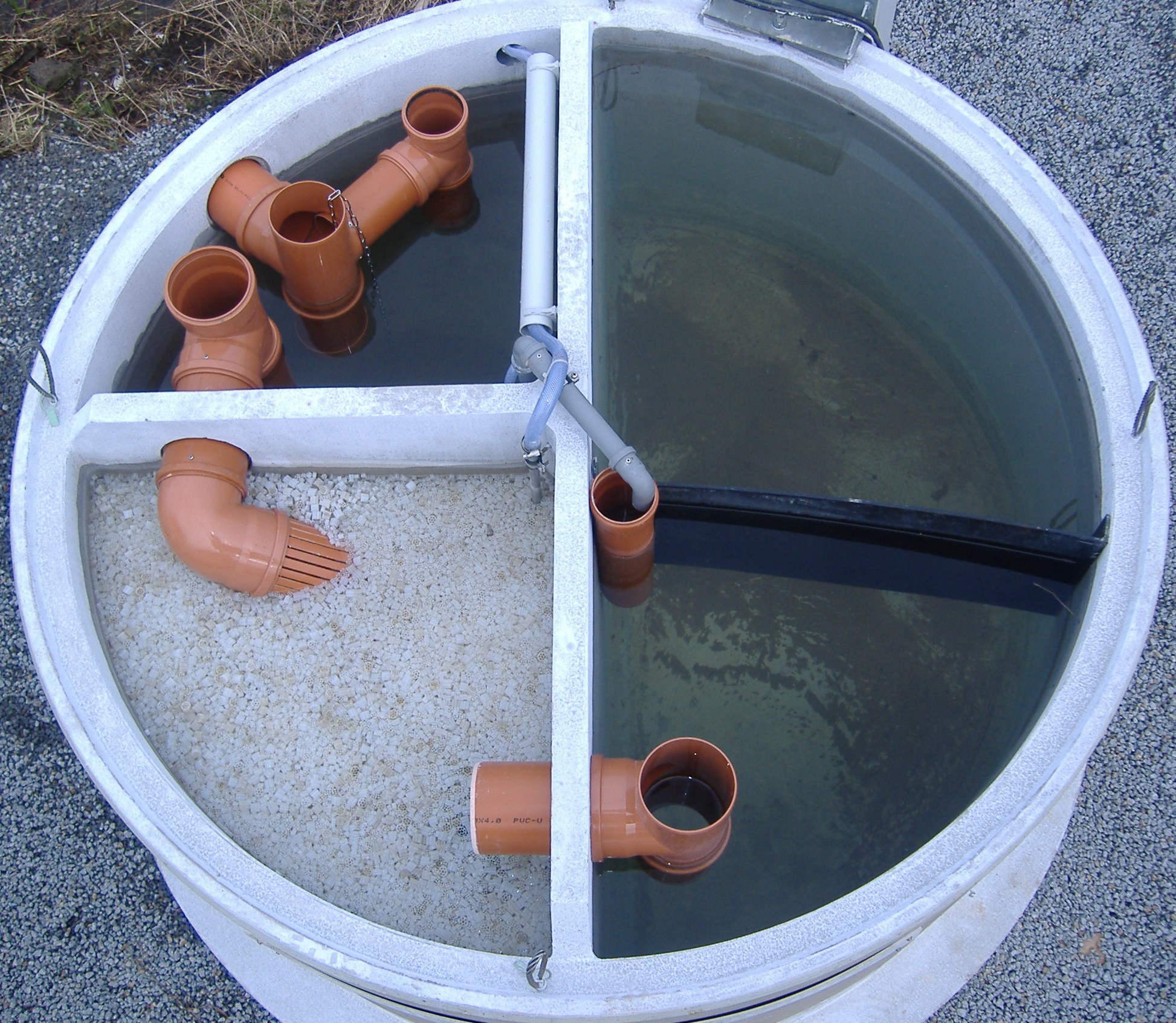 Das gereinigte Wasser gelangt über eine integrierte Probenahmeeinrichtung (optional) in ein Gewässer oder wird versickert. Die Probenahmeeinrichtung dient der einfachen Stichprobe zur Überprüfung der geforderten Ablaufwerte nach DIN EN 12566 Teil 3.